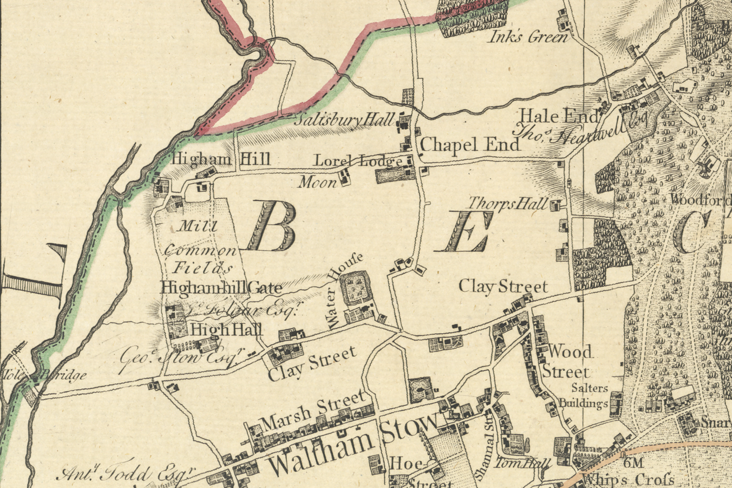 The first map of the entire of Essex from 1777 (bottom portion of left column on the full map) shows Higham Hill and its surroundings were largely rural farmland with only a scattering of buildings. Blackhorse Rd, Billet Rd, Higham Hill Rd, Chingford Rd, and Forest Rd (then called Clay Street) were the only roadways along with Folly Lane, which extended north to Chingford Green along the route of today’s Hall Lane A1009.