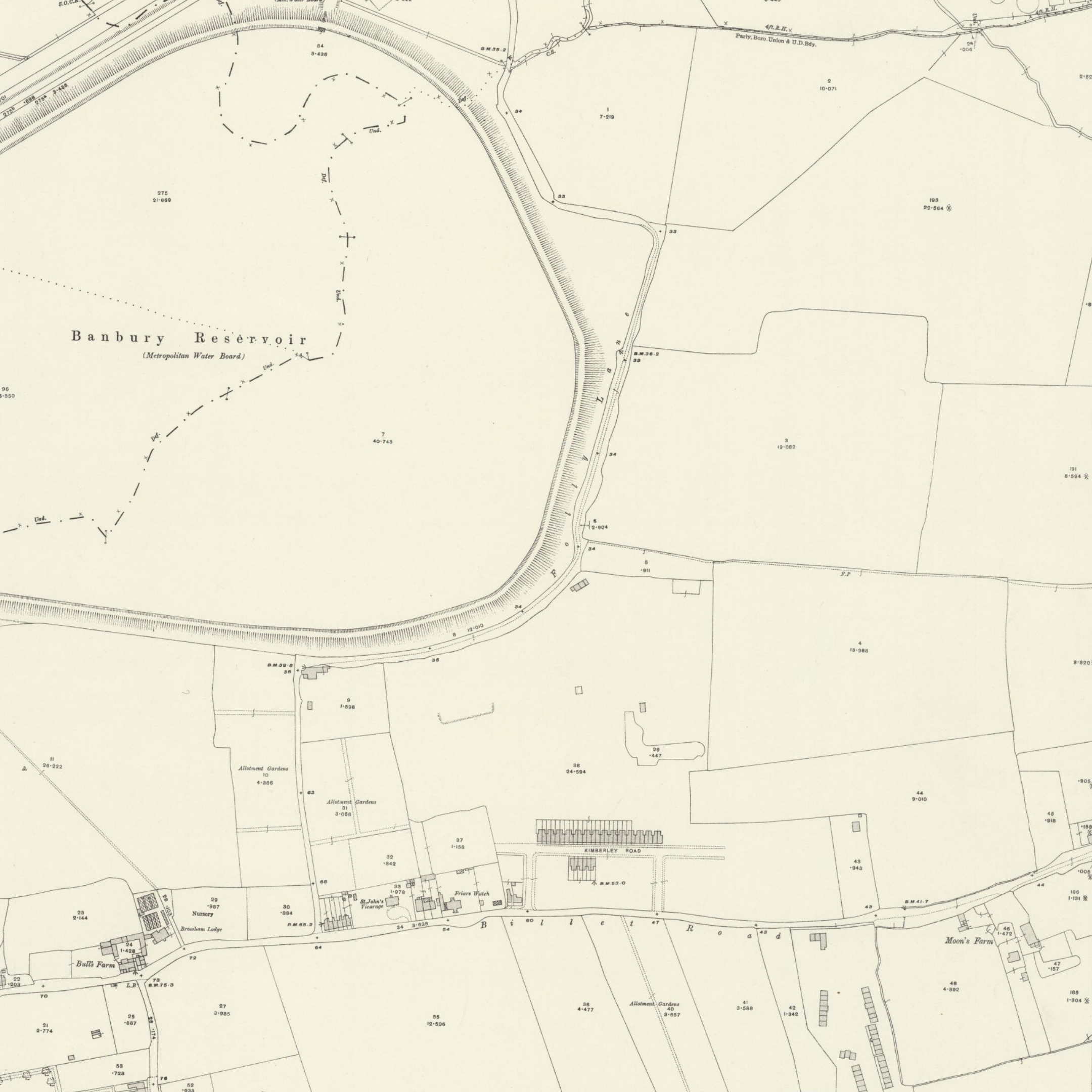 1893: The Royal Commission on Water Supply (Balfour Committee) lead to the eventual creation of four additional reservoirs: Lockwood, Banbury, William Girling, and King George V, as well as the River Lee Diversion (its original course ran through the centre of what is now Banbury Reservoir so was re-channelled to the west of it). Works to create Banbury Reservoir and divert the River Lee were completed in 1903.