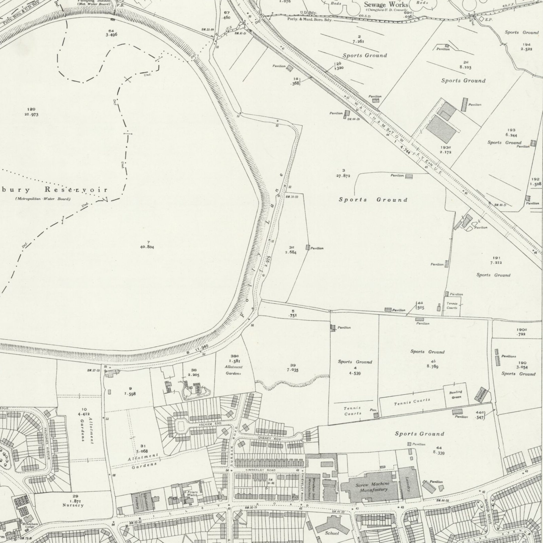 By the 1930’s, the Folly Lane triangle formed a large complex of allotments and sports grounds bisected by the A406, complete with multiple tennis courts and pavilions. Map OS 25 Inch Essex LXXVII.4 of 1935 shows this the clearest.